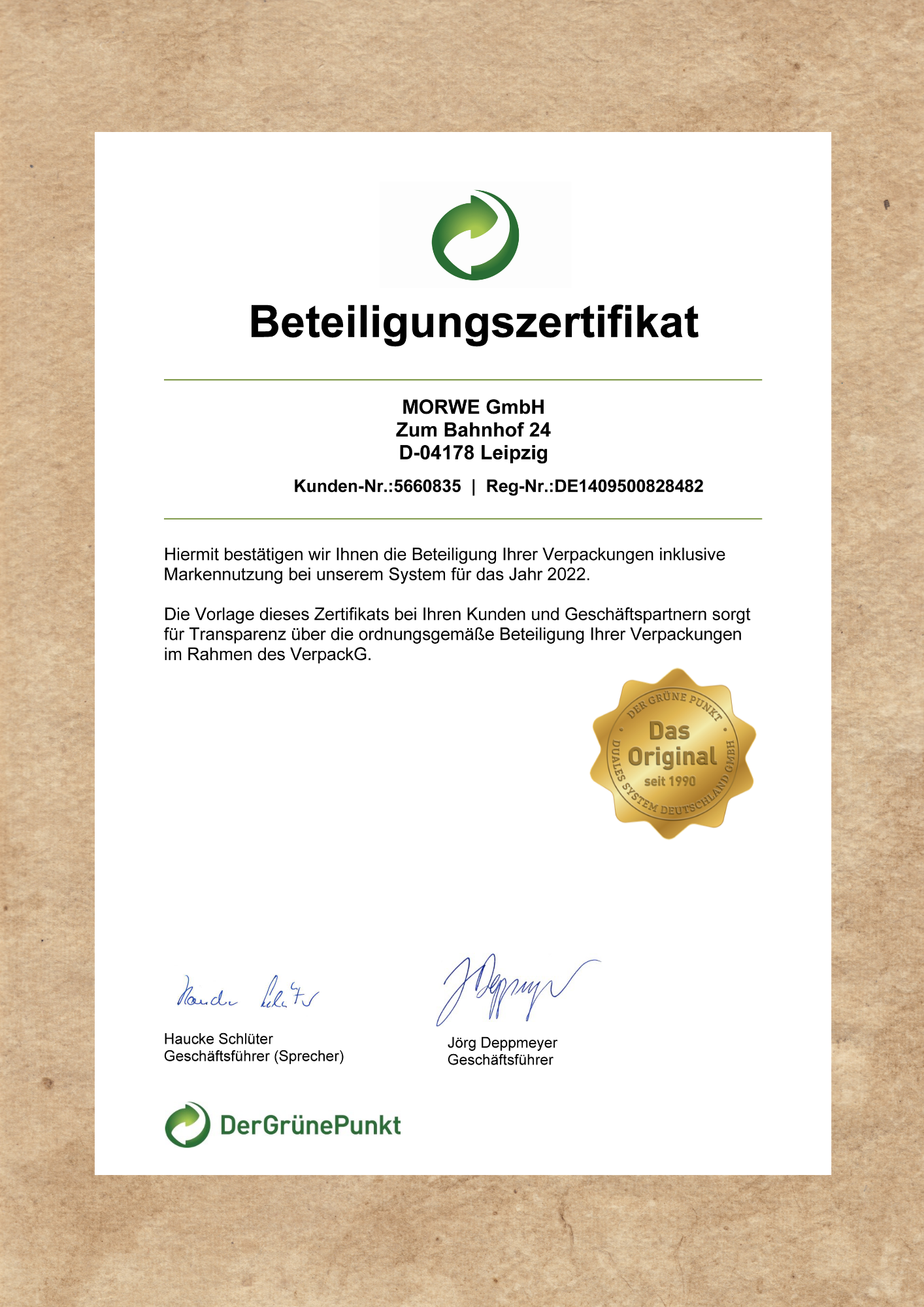 Unserer Verpackungen bestehen zu 100% aus recyceltem Papier und werden ohne Plastikfolie verschickt. In seltenen Fällen kann es hierzu zu kleinen Beschädigungen und Verformungen durch Feuchtigkeit kommen, hier bitten wir um eure Nachsicht der Umwelt zuliebe. In Kooperation mit dem Grünen Punkt zertifizieren wir jährlich unsere Verpackungen und beteiligen uns mit einer Gebühr an der ordnungsgemäßen Entsorgung und Recycling der Verpackungen.